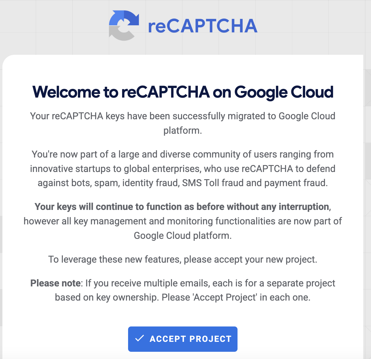 Look for a banner or notice at the top of the page referencing Google Cloud migration and click the button that says “Migrate Keys”. This will redirect you to the Google Cloud and Google will automatically configure the project for reCAPTCHA.